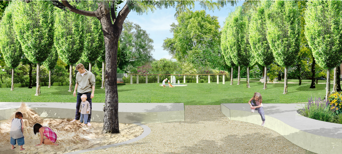 Změní se pojetí dětského vyžití. V novém parku už nebude jedno centrální hřiště jako doposud. Různé herní prvky najdou děti na několika místech v parku – houpačky a houpací sítě u severních cest, největší dětská zóna má vzniknout v prostoru někdejší střelnice, kde bude uprostřed velké pískoviště s prolézačkami, a pro starší děti a dospělé přibude menší fitness hřiště s bradly a hrazdami.