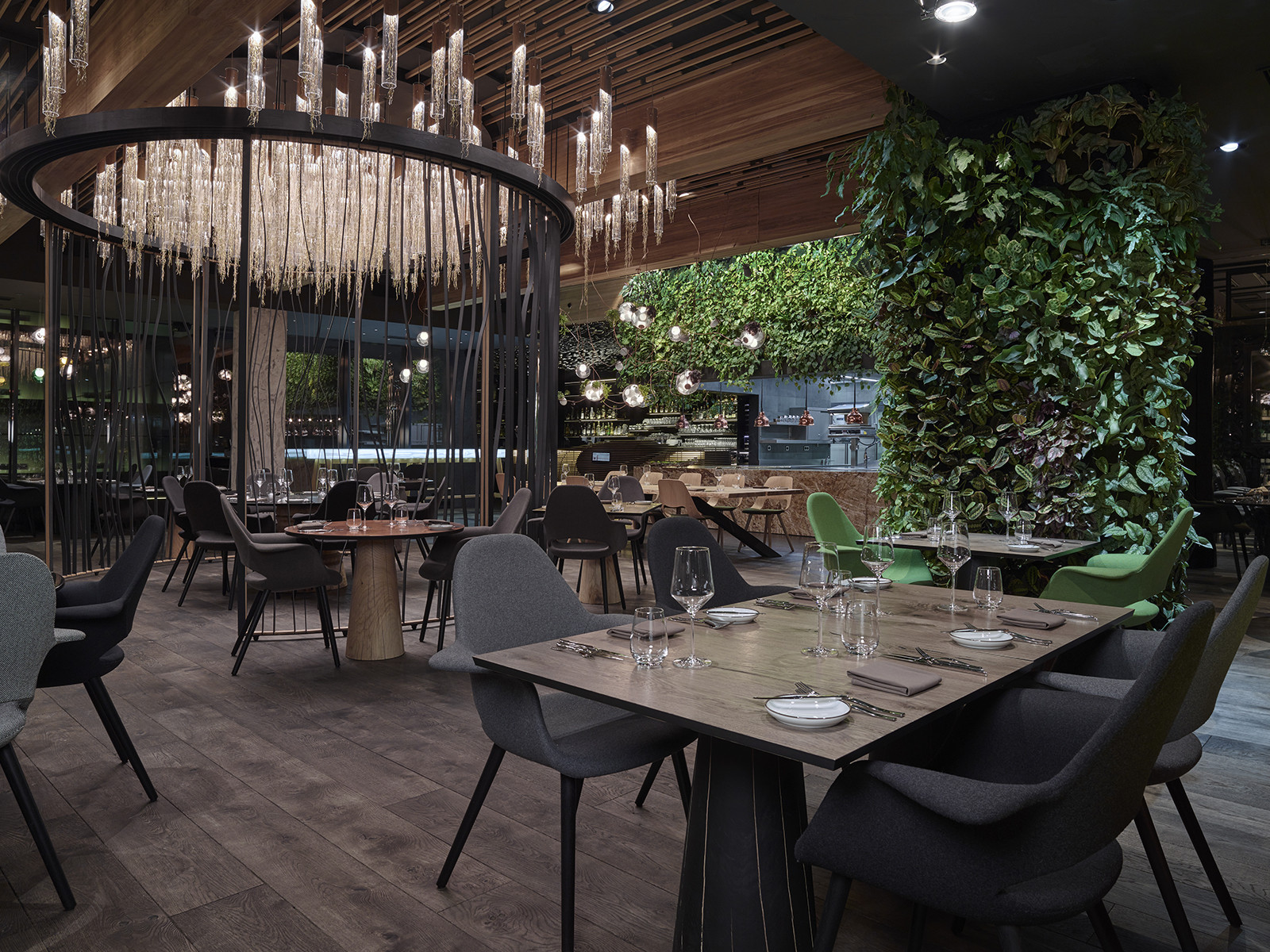 „V otevřené kuchyni, která je vidět z celého podniku, tým připravuje moderní jídla s jemnými mezinárodními akcenty.“