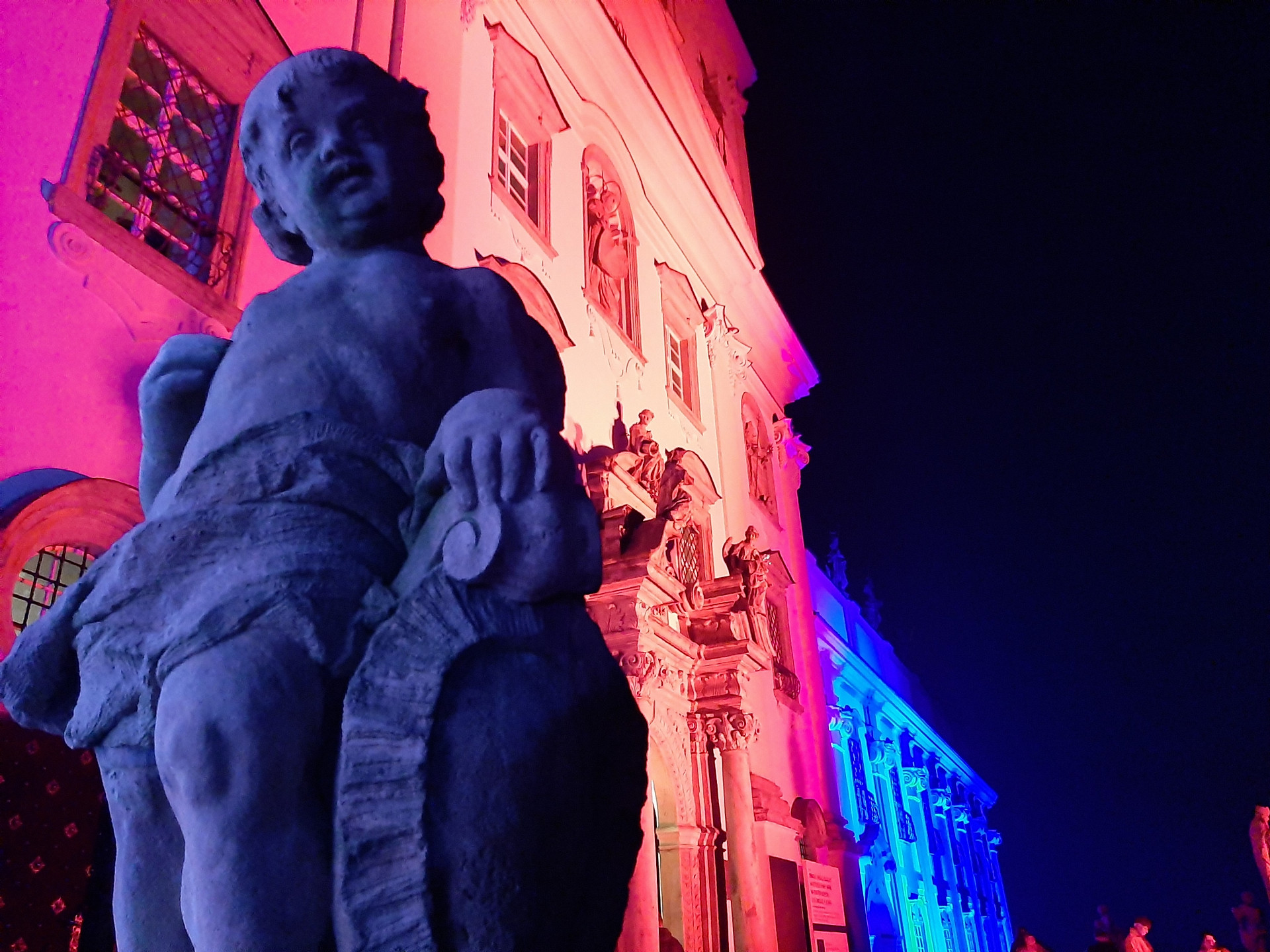 České národní barvy, červená, bílá a modrá, rozzářily dnes po setmění dvě významné olomoucké památky. Baziliku a olomouckou radnici.